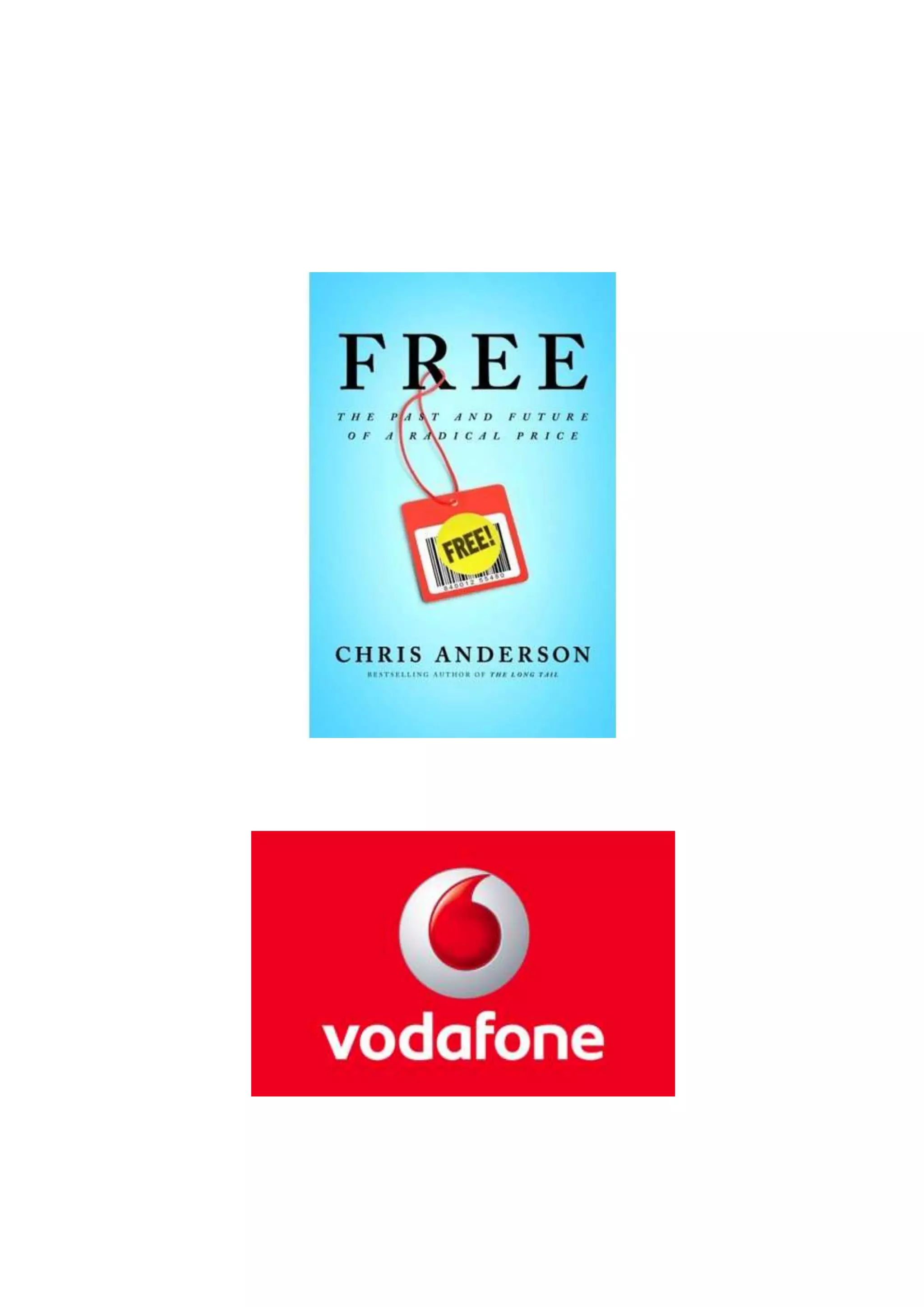 O documento discute o livro "Free" e como ele descreve a economia do grátis. A Vodafone é usada como exemplo de como uma empresa usa estratégias como oferecer serviços grátis temporariamente para atrair novos clientes, como pacotes de TV grátis por tempo limitado e dias com chamadas grátis entre a mesma rede. A Vodafone também oferece pacotes de serviços combinados por um preço fixo mensal e subsídios cruzados para atrair empresas.