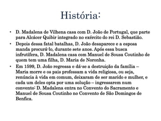 D. Madalena é uma mulher nobre que se apaixona por Manuel de Sousa Coutinho enquanto seu marido D. João estava desaparecido. Anos mais tarde, D. João regressa, destruindo a família de Madalena. Ao longo da obra, Madalena é atormentada pela culpa e medo, vendo presságios de desgraça. Quando descobre que D. João ainda vive, sua família é destruída, forçando-a e Manuel a entrarem em conventos.