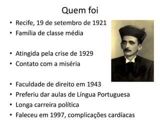 Este documento resume a vida e obra de Paulo Freire, educador brasileiro. Ele nasceu em 1921 em Recife em uma família de classe média, e foi impactado pela crise de 1929. Formou-se em Direito mas preferiu lecionar Língua Portuguesa. Defendeu a educação como prática da liberdade e viu o homem como um ser multidimensional e criador que interfere no meio. Faleceu em 1997 devido a complicações cardíacas.
