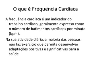 O documento discute o que é frequência cardíaca, como medir a frequência cardíaca e como calcular a frequência cardíaca máxima. A frequência cardíaca é o número de batimentos cardíacos por minuto e pode ser medida no pulso ou carótida. A frequência cardíaca de repouso é medida após acordar. A frequência cardíaca máxima corresponde ao número máximo de batimentos e pode ser calculada subtraindo a idade da pessoa de 220.