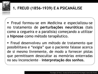 Sigmund Freud desenvolveu a psicanálise, um método terapêutico e teoria da mente. Ele acreditava que o inconsciente, não a consciência, domina o comportamento humano. O inconsciente contém desejos reprimidos que se manifestam através de sonhos, atos falhados e neuroses. Freud também propôs que a mente humana consiste no id, ego e superego.