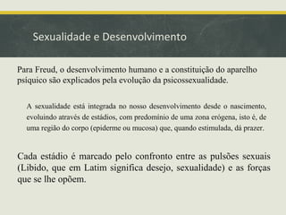 Freud acreditava que o desenvolvimento psicológico ocorre em estágios psicossexuais, onde diferentes zonas do corpo trazem prazer. Cada estádio traz conflitos entre desejos e restrições. A teoria descreve estágios desde o nascimento até a adolescência, culminando no complexo de Édipo, formação do superego e maturidade genital.