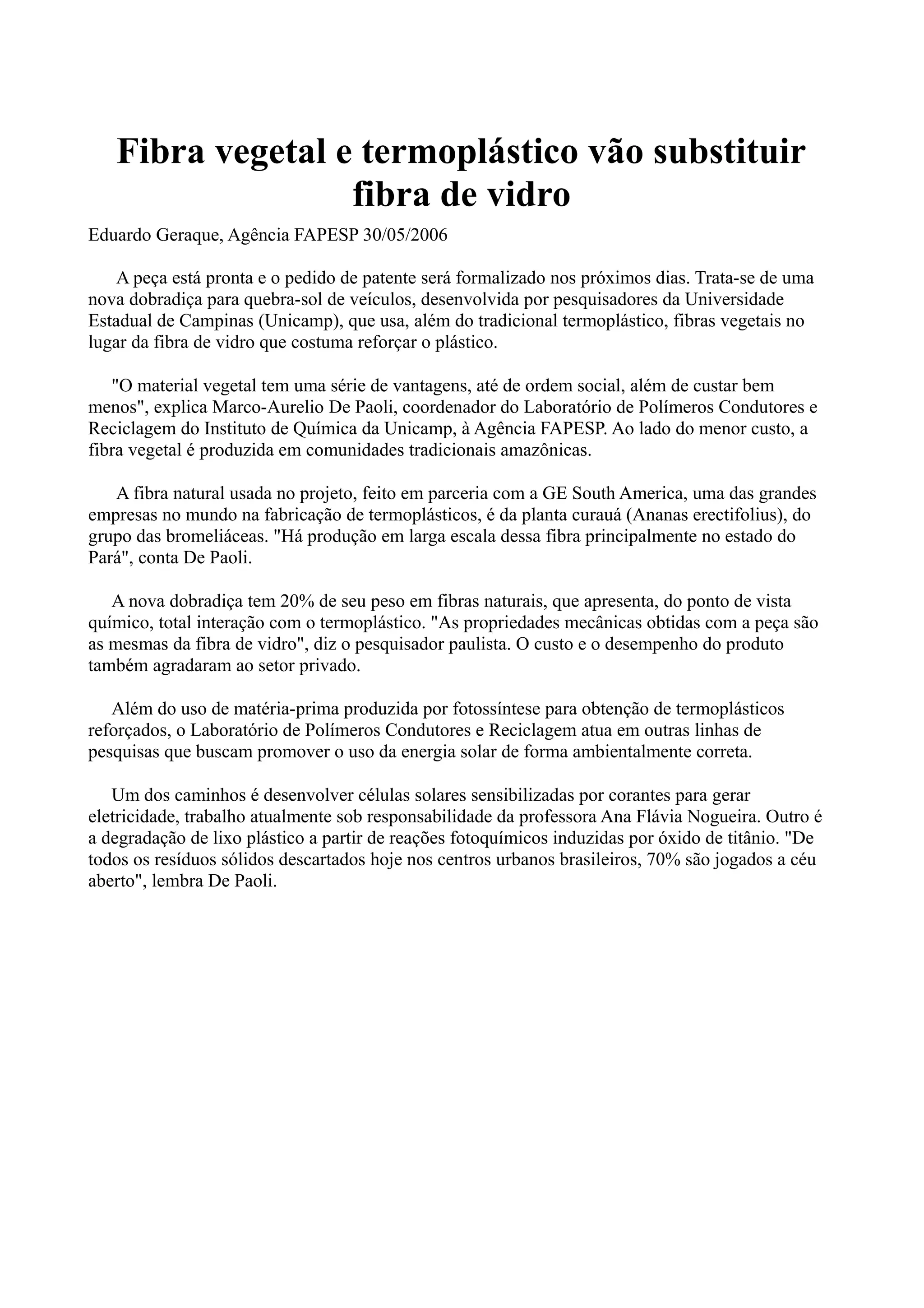 1) Pesquisadores da Unicamp desenvolveram uma nova dobradiça para quebra-sol de veículos que usa fibras vegetais no lugar da fibra de vidro para reforçar o termoplástico.