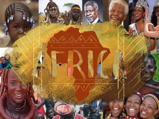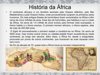 O documento resume a história da África, desde os primeiros seres humanos que habitaram o continente há milhões de anos, passando pelos reinos e impérios que se formaram ao longo dos séculos, até a colonização européia no século XIX e a independência da maioria dos países africanos na década de 1970. Apesar dos desafios atuais como a pobreza e as consequências do colonialismo, a África mantém uma rica diversidade cultural e representa o berço da humanidade.