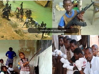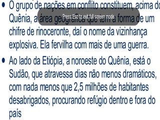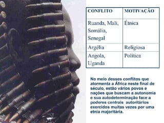 O documento discute a história e situação atual da África, incluindo os efeitos da colonização européia e estabelecimento de fronteiras artificiais, a independência e neocolonialismo. É fornecido contexto sobre regiões específicas como o Chifre Africano, Sahel e Serra Leoa, com detalhes sobre população, economia e desafios de direitos humanos.