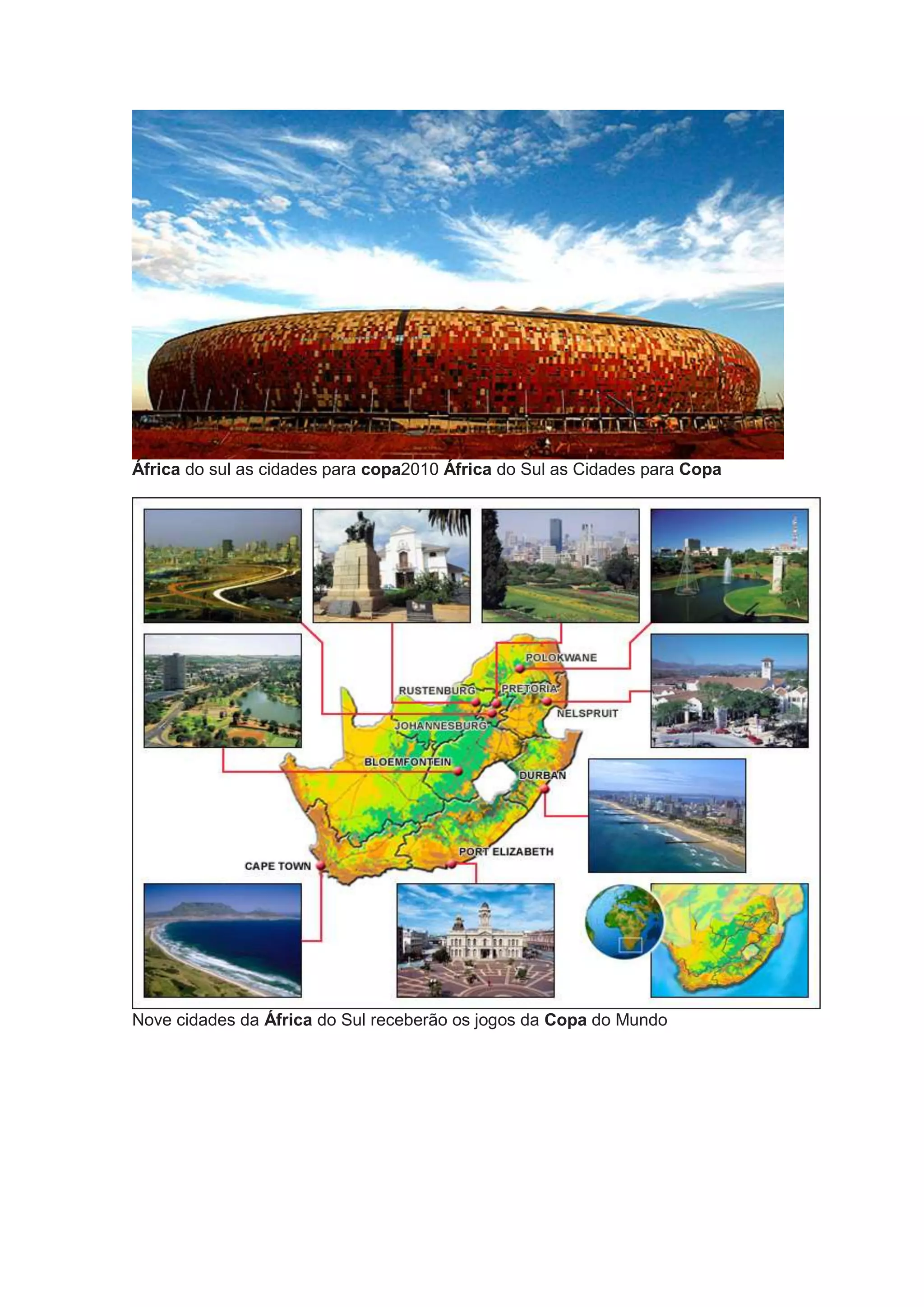 Nove cidades da África do Sul sediarão jogos da Copa do Mundo de 2010, a primeira a ser realizada na África. A África do Sul foi escolhida como sede devido à sua infraestrutura, apesar de ter sido eliminada na primeira fase nas duas Copas anteriores que participou. Times africanos vêm se destacando mais em Copas recentes, contribuindo para a decisão da FIFA de realizar o primeiro Mundial no continente.