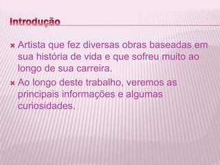 O documento discute a vida e obra da artista mexicana Frida Kahlo, destacando que ela pintava sobre sua própria vida e experiências, marcadas por grandes tragédias. O texto também lista e descreve algumas de suas obras mais famosas, que retratam esses momentos difíceis por que passou.