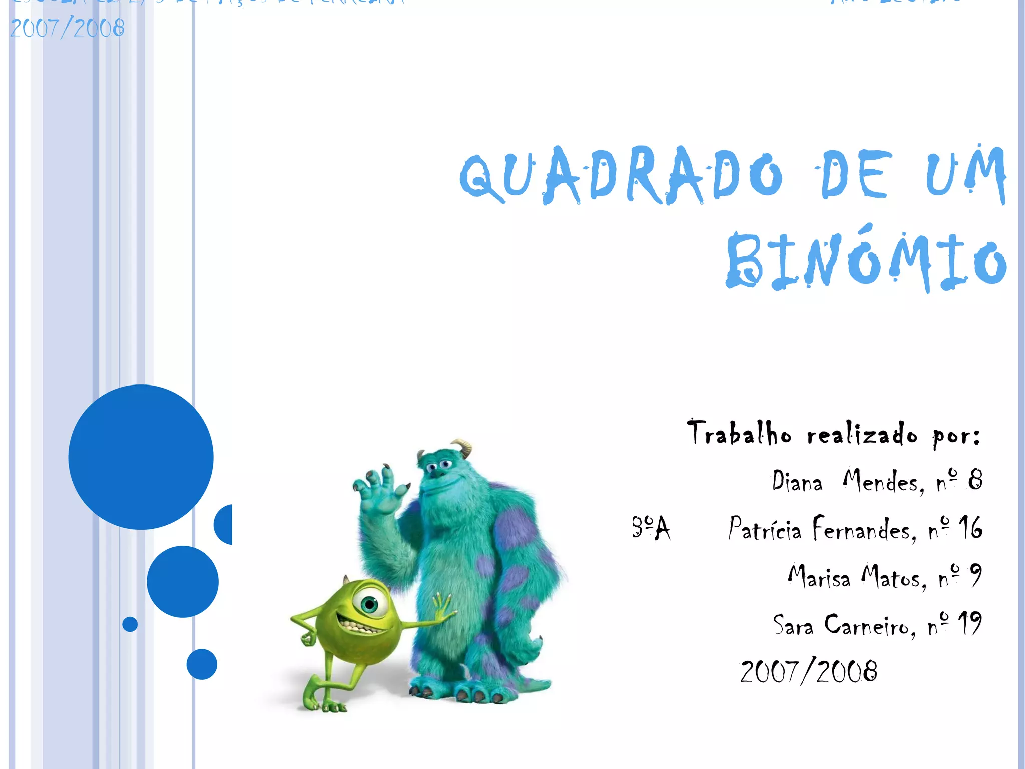O documento discute o quadrado de um binômio e fornece exemplos de como calcular a área total de um terreno dividido em seções para uma casa, piscina e jardim. A fórmula geral para o quadrado de um binômio é apresentada, juntamente com exemplos numéricos de cálculo de áreas.