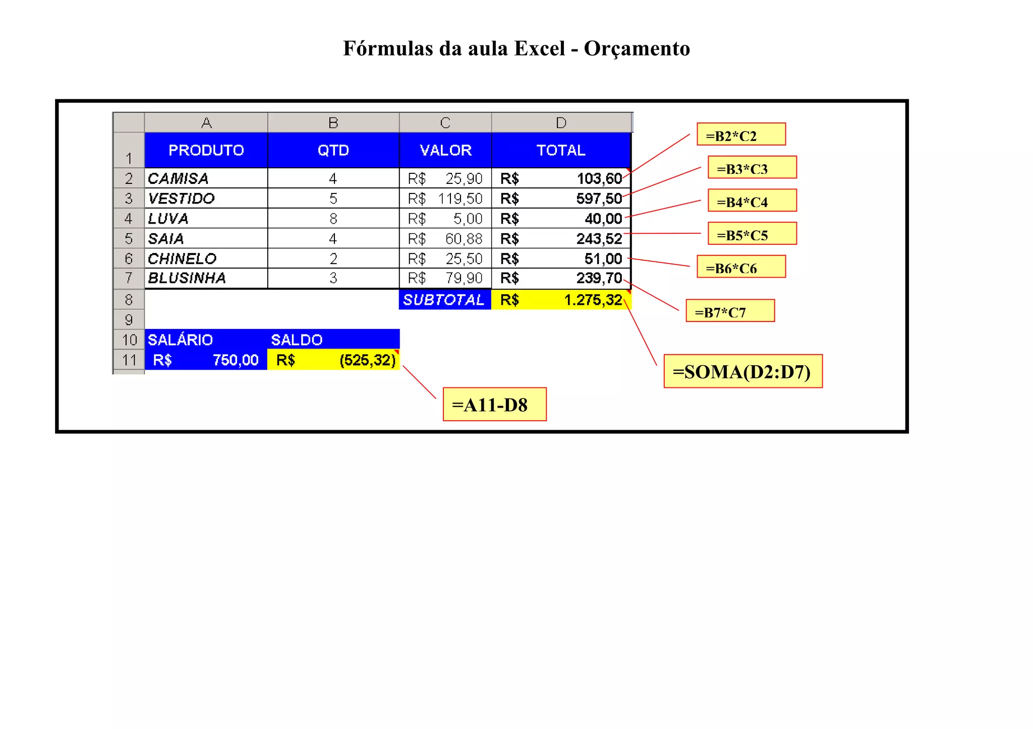 Este documento contém fórmulas em Excel para calcular um orçamento. As fórmulas multiplicam os valores nas células B pelos valores nas células C para linhas individuais, somam esses resultados e subtraem o total da soma de uma célula A específica.