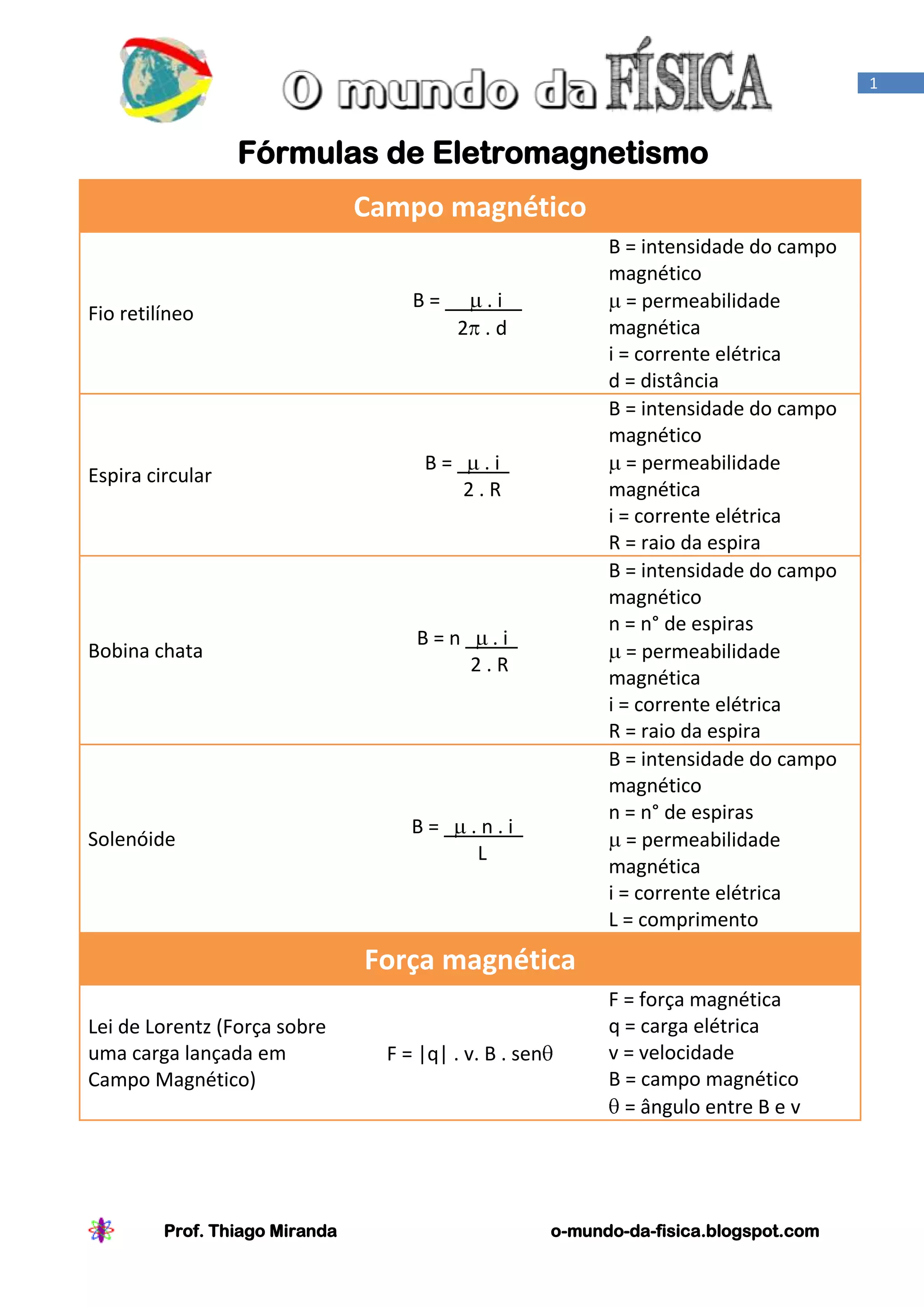 Este documento resume fórmulas fundamentais do eletromagnetismo, incluindo a intensidade do campo magnético produzido por fios retilíneos, espiras circulares, bobinas e solenóides, assim como fórmulas para força magnética, raio da trajetória de partículas carregadas, período de movimento, força sobre condutores e força entre condutores.