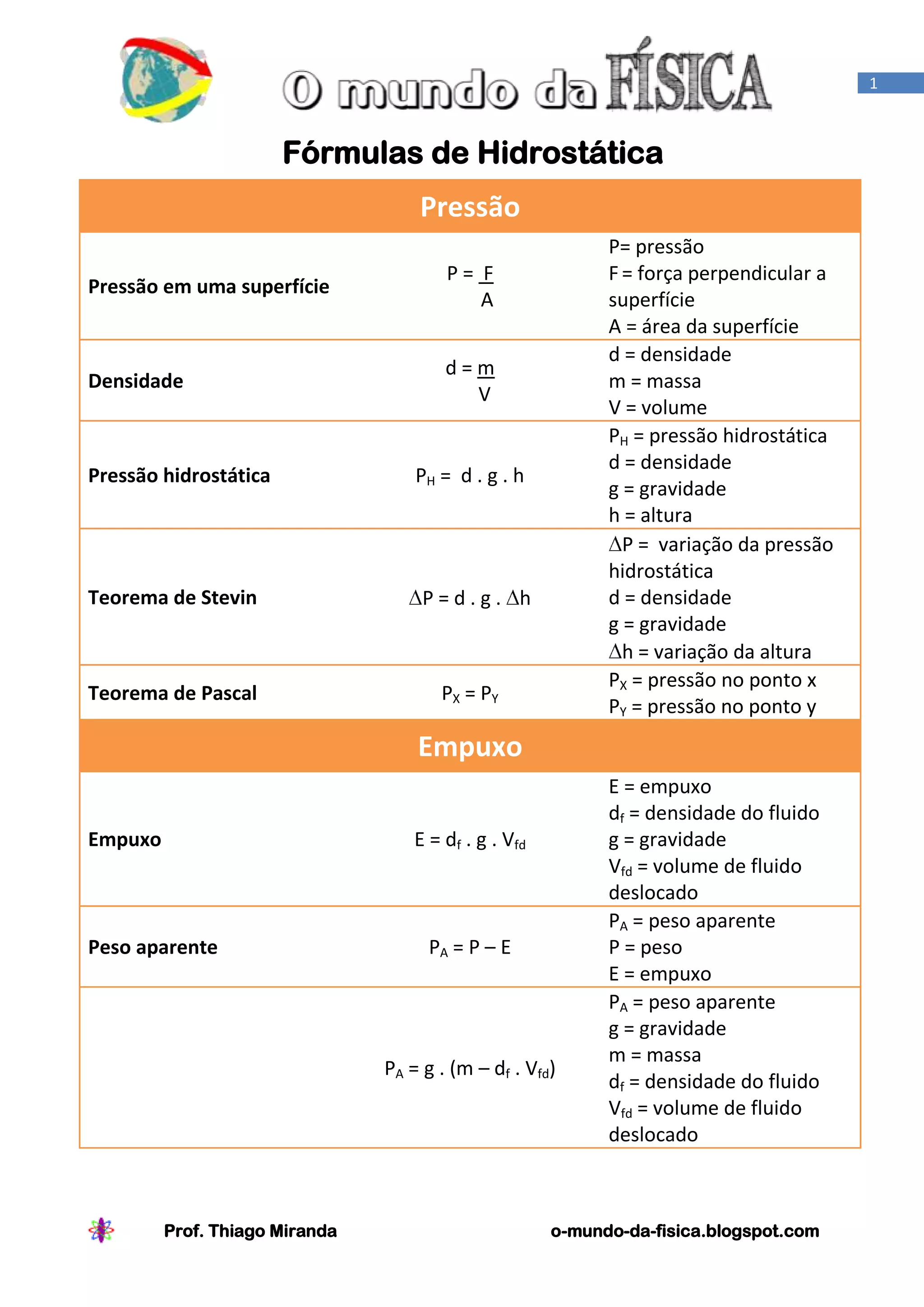 O documento resume as principais fórmulas da hidrostática, incluindo a definição de pressão como força sobre área, densidade como massa sobre volume, pressão hidrostática variando com a densidade, gravidade e altura de acordo com o Teorema de Stevin, e pressão em qualquer ponto variando de acordo com o Teorema de Pascal. Também define empuxo como o volume de fluido deslocado multiplicado pela densidade e gravidade, e peso aparente como a diferença entre peso real e empuxo.