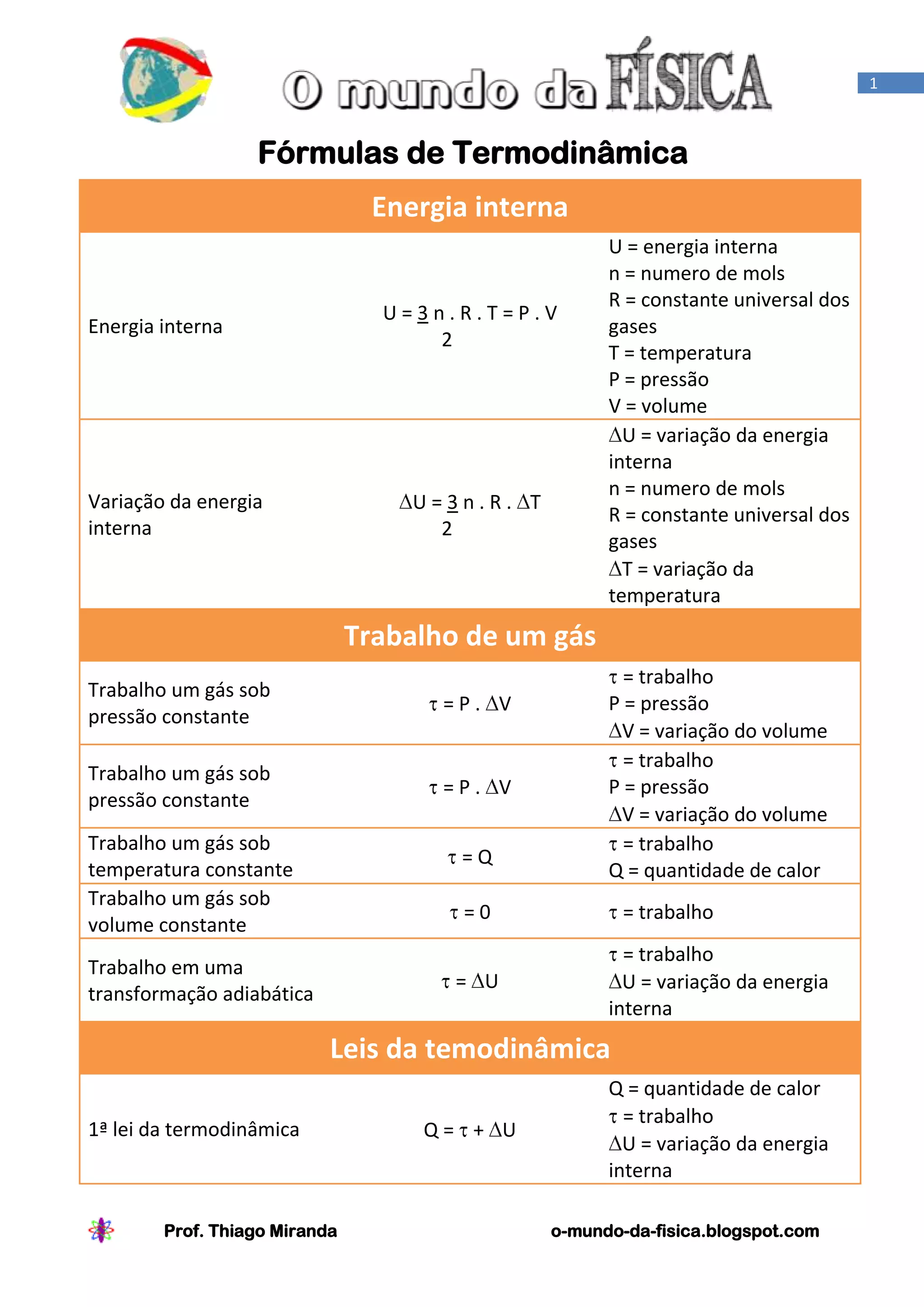 O documento resume as principais fórmulas da termodinâmica, incluindo a primeira lei da termodinâmica, o trabalho em processos isobáricos e isotérmicos, e as definições de energia interna, calor e trabalho. Também apresenta fórmulas para o rendimento e o trabalho em máquinas térmicas e no ciclo de Carnot.
