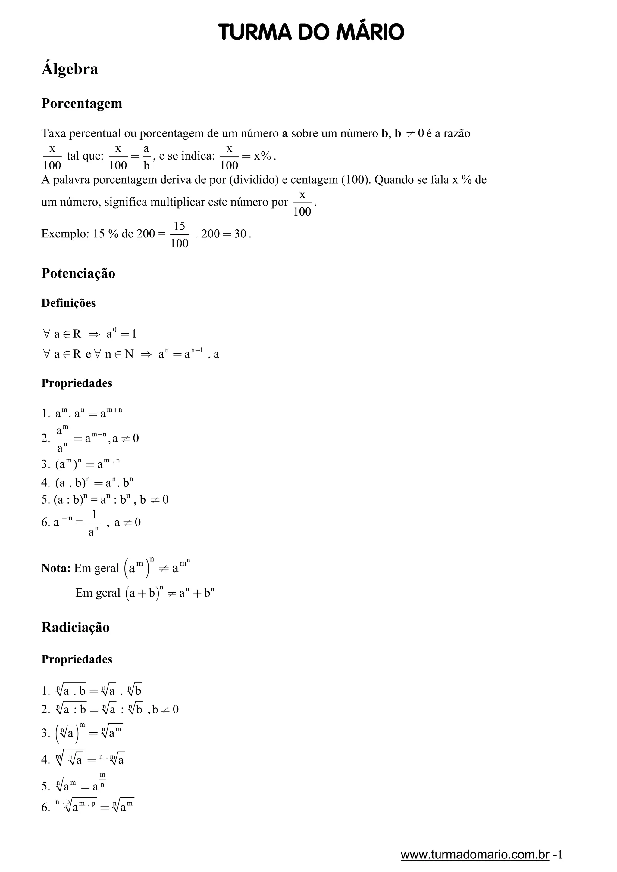 1) O documento apresenta conceitos fundamentais de álgebra, como porcentagem, potenciação, radiciação e fatoração.