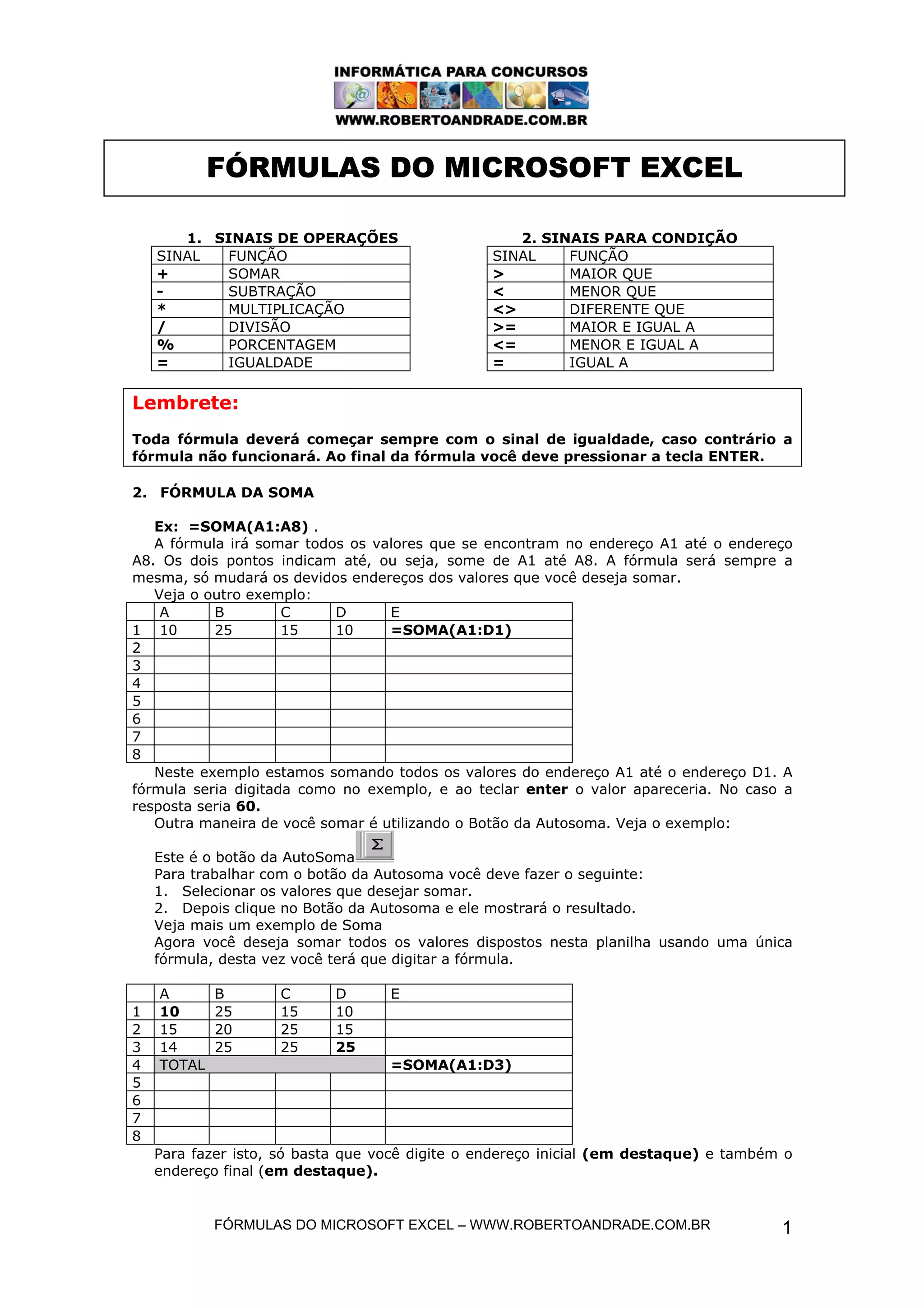 FÓRMULAS DO MICROSOFTEXCEL – WWW.ROBERTOANDRADE.COM.BR 1