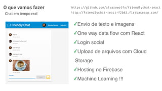 O documento descreve como criar uma aplicação de chat em tempo real usando React e Firebase. Ele explica como usar o React para construir componentes, gerenciar estado e fluxo de dados. Também mostra como o Firebase fornece armazenamento em nuvem, autenticação e hospedagem para a aplicação.