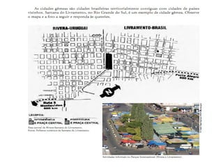 O documento discute o conceito de fronteiras, definindo-as como limites que separam territórios e facilitam a interação entre países. As fronteiras permeáveis permitem a troca de mercadorias, informações e pessoas, promovendo um dinamismo econômico nas regiões de fronteira. Exemplos de cidades gêmeas e fronteiras internacionais enfatizam a importância dessas áreas para a integração e colonização.