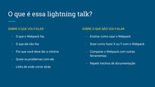 O documento apresenta o Webpack, uma ferramenta de empacotamento de módulos que permite carregar dependências de forma otimizada. O Webpack usa plugins e loaders para processar diferentes tipos de arquivos e gerar um único arquivo de saída, resolvendo dependências de forma recursiva. Embora o Webpack não execute tarefas como compilação de Sass ou transpilação de ES6 diretamente, ele suporta esses casos por meio de loaders adequados.