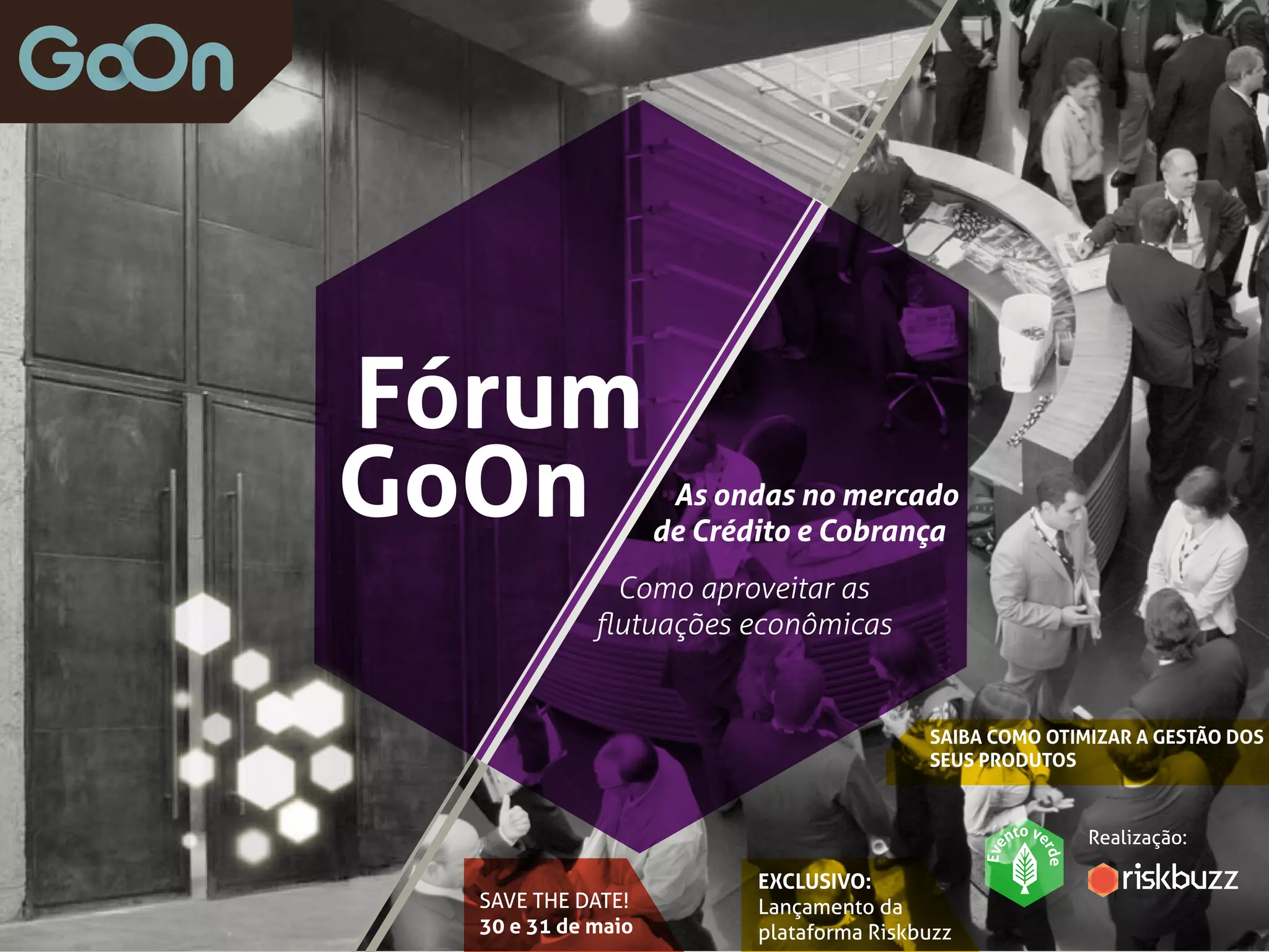 O documento anuncia o Fórum GoOn 2012, um evento de 2 dias sobre crédito e cobrança. O evento contará com palestrantes renomados do setor e debates sobre gestão de risco de crédito. Durante o evento será lançada uma nova plataforma chamada Riskbuzz.