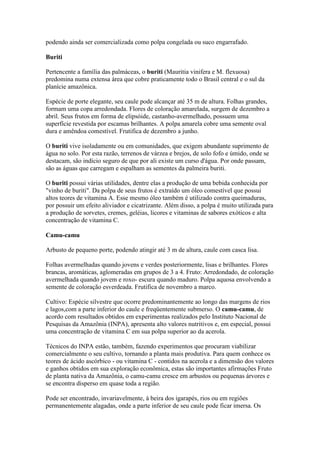 O documento descreve diversas frutas nativas da Amazônia, incluindo suas características, usos e propriedades nutricionais. Frutas como açaí, araçá-boi, buriti, camu-camu, cupuaçu, graviola e pupunha são detalhadamente apresentadas.