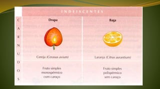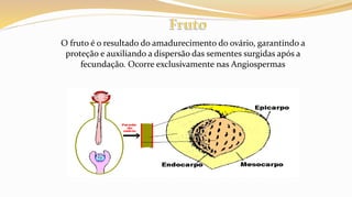 O fruto protege e dispersa as sementes, sendo o resultado do desenvolvimento do ovário após a fecundação em angiospermas. O pericarpo do fruto é formado por três camadas e protege as sementes, as quais contém o embrião e endosperma. A dispersão de frutos e sementes ocorre por meios como zoocoria, anemocoria e hidrocoria.