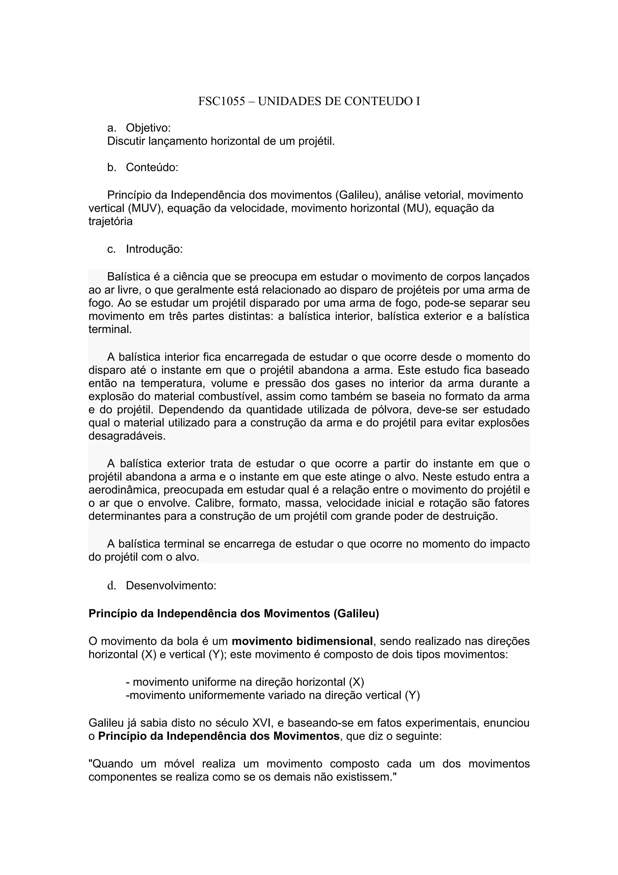 1) O documento discute o lançamento horizontal de um projétil, analisando seu movimento bidimensional em componentes horizontal e vertical.