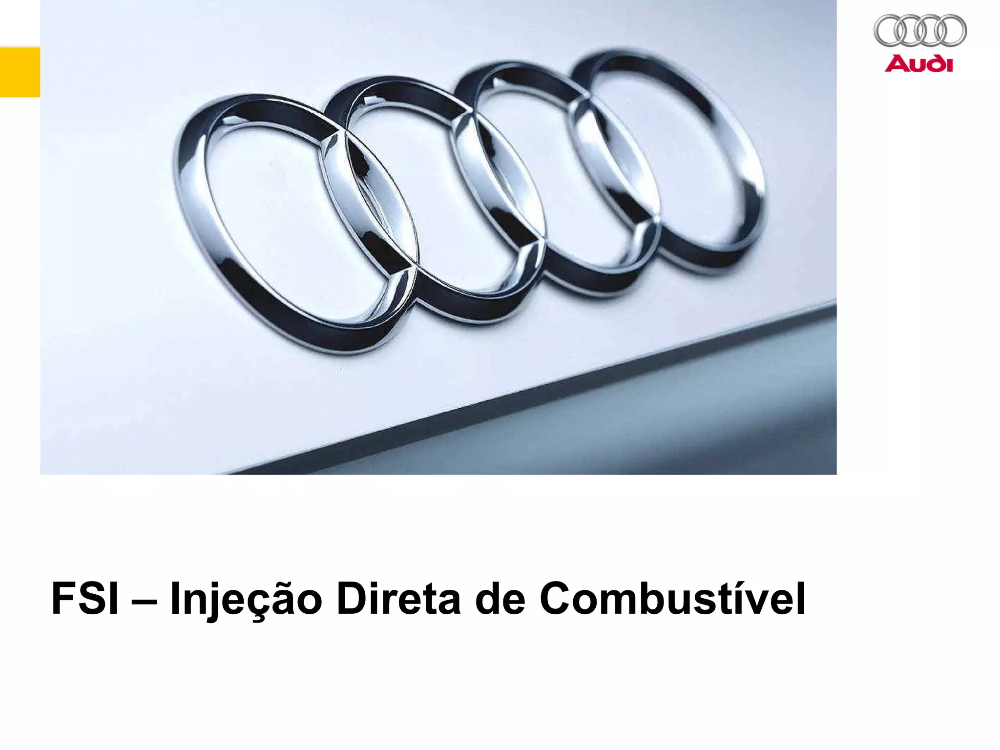 O documento descreve o sistema de injeção direta de combustível FSI, incluindo como funciona, como diagnosticá-lo e suas características principais. É detalhado o funcionamento do motor 2.0 Turbo FSI, com ênfase nos componentes como a bomba de combustível de alta pressão, válvulas de injeção, catalisador de armazenamento de NOx e sistema de sobrealimentação.
