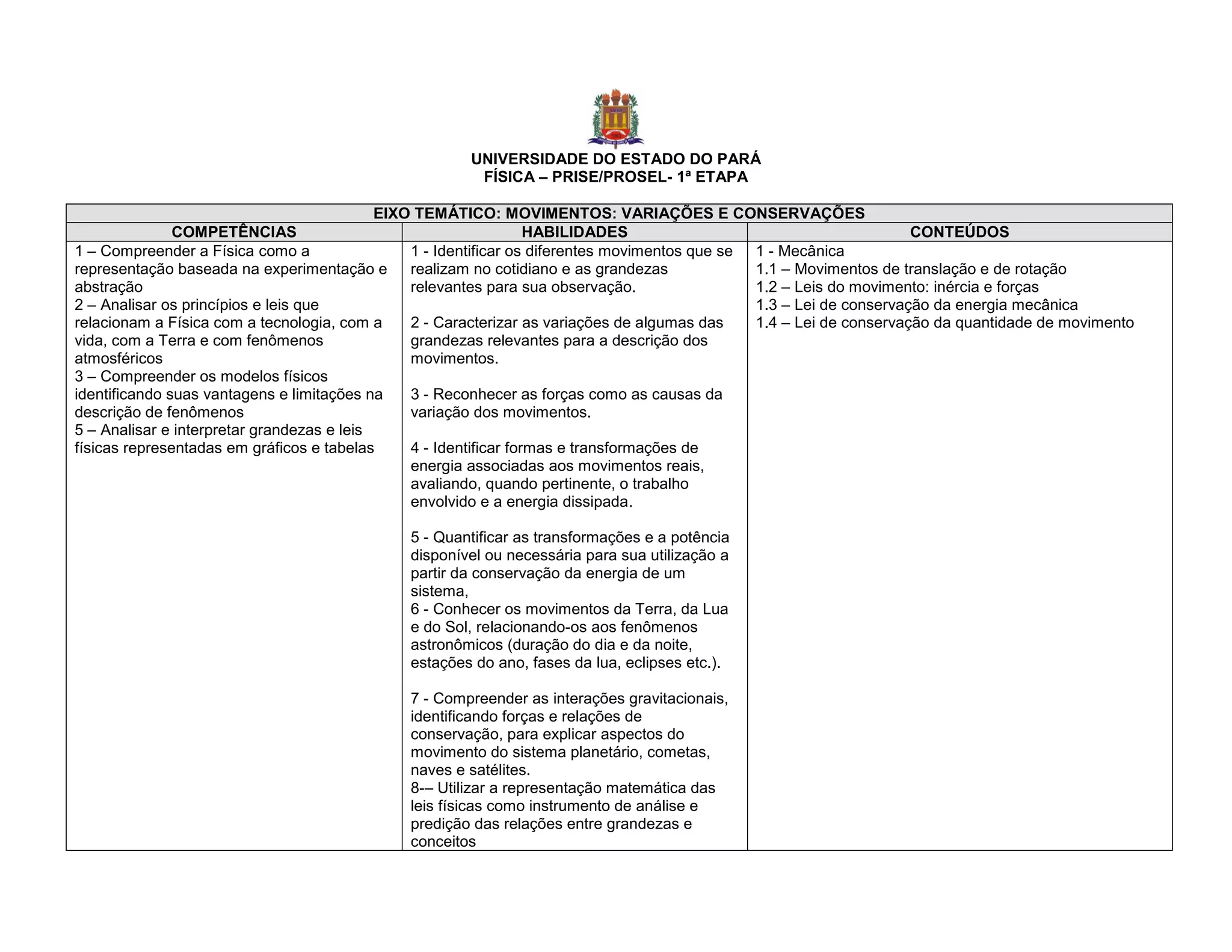 1) O documento apresenta os eixos temáticos, competências, habilidades e conteúdos para o ensino de Física em quatro etapas;