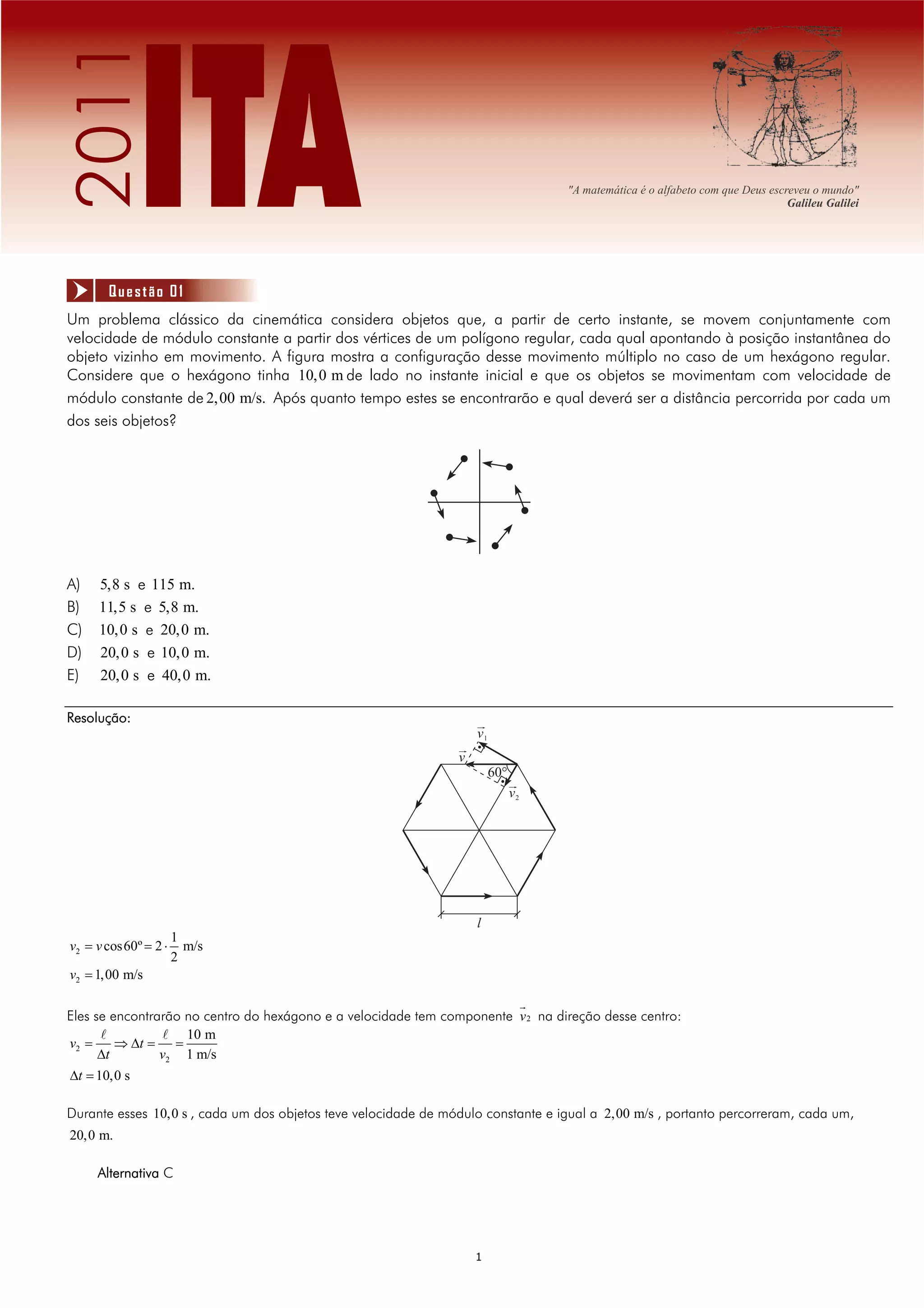 Este documento apresenta um problema clássico da cinemática que considera objetos se movendo conjuntamente em um polígono regular com velocidade constante. Após quanto tempo os objetos se encontrarão e qual será a distância percorrida por cada um? A resposta é que eles se encontrarão após 10 segundos no centro do hexágono, tendo cada um percorrido 20 metros.