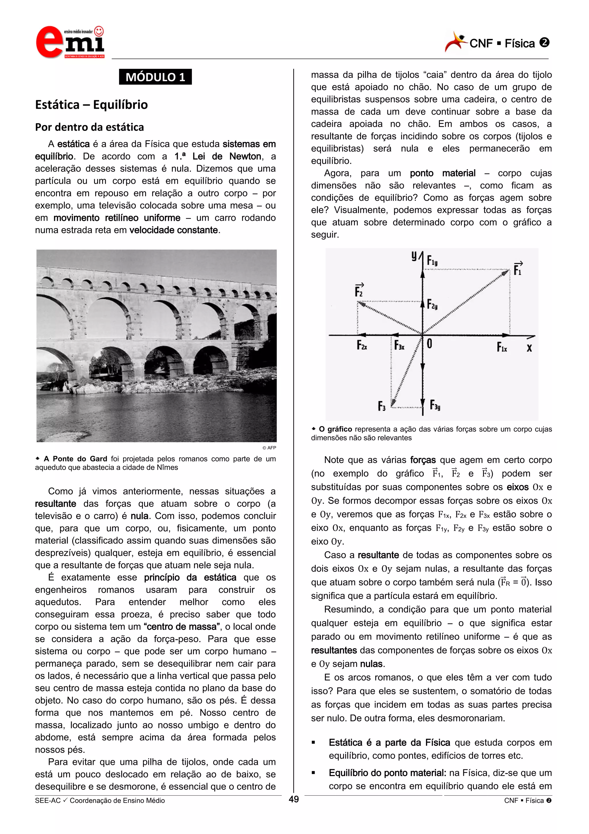 O documento descreve os princípios da estática aplicados na construção de aquedutos pelos romanos. Explica que para um corpo estar em equilíbrio, a resultante de todas as forças que atuam nele deve ser nula. Os engenheiros romanos aplicaram este princípio ao projetar arcos cujas pedras permaneciam em equilíbrio apenas pela força de contato entre elas.