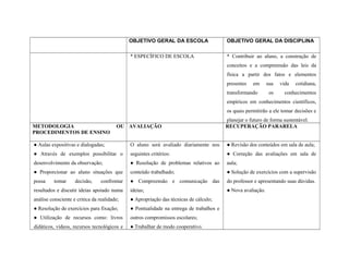 Este documento apresenta o planejamento anual de ensino da disciplina de Física para o ano de 2013. Contém os objetivos gerais da escola e da disciplina, a metodologia de ensino, os conceitos e conteúdos abordados por bimestre para os anos do 1o, 2o e 3o, as referências bibliográficas utilizadas e a avaliação e recuperação paralela dos estudantes. Os tópicos incluem mecânica clássica, termodinâmica, eletrostática, eletrodinâm