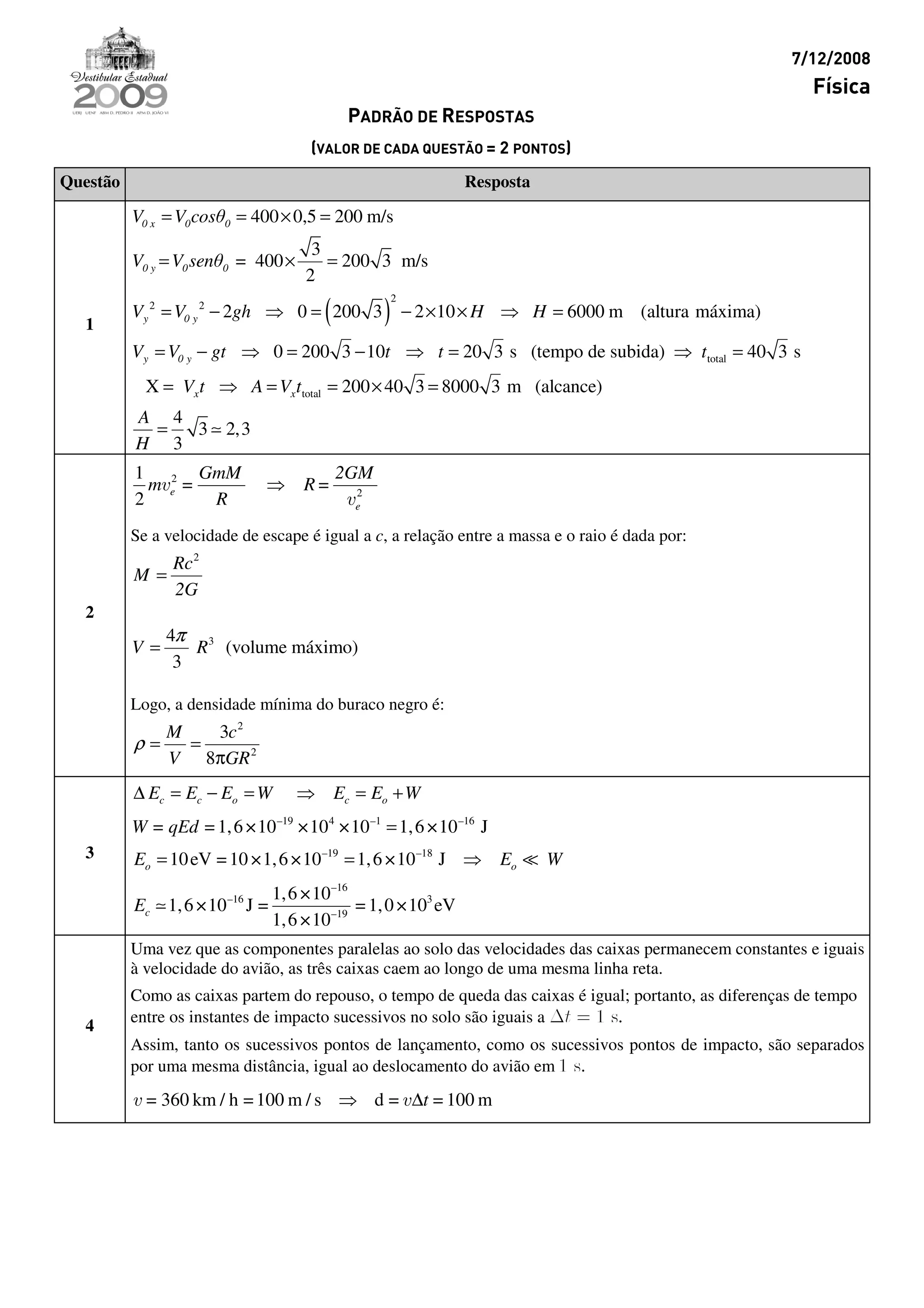 1) O documento apresenta as respostas para questões de física, incluindo cálculos de velocidade inicial, altura máxima, tempo de subida, alcance horizontal de um projétil, velocidade de escape de um corpo, densidade mínima de um buraco negro e mais.
