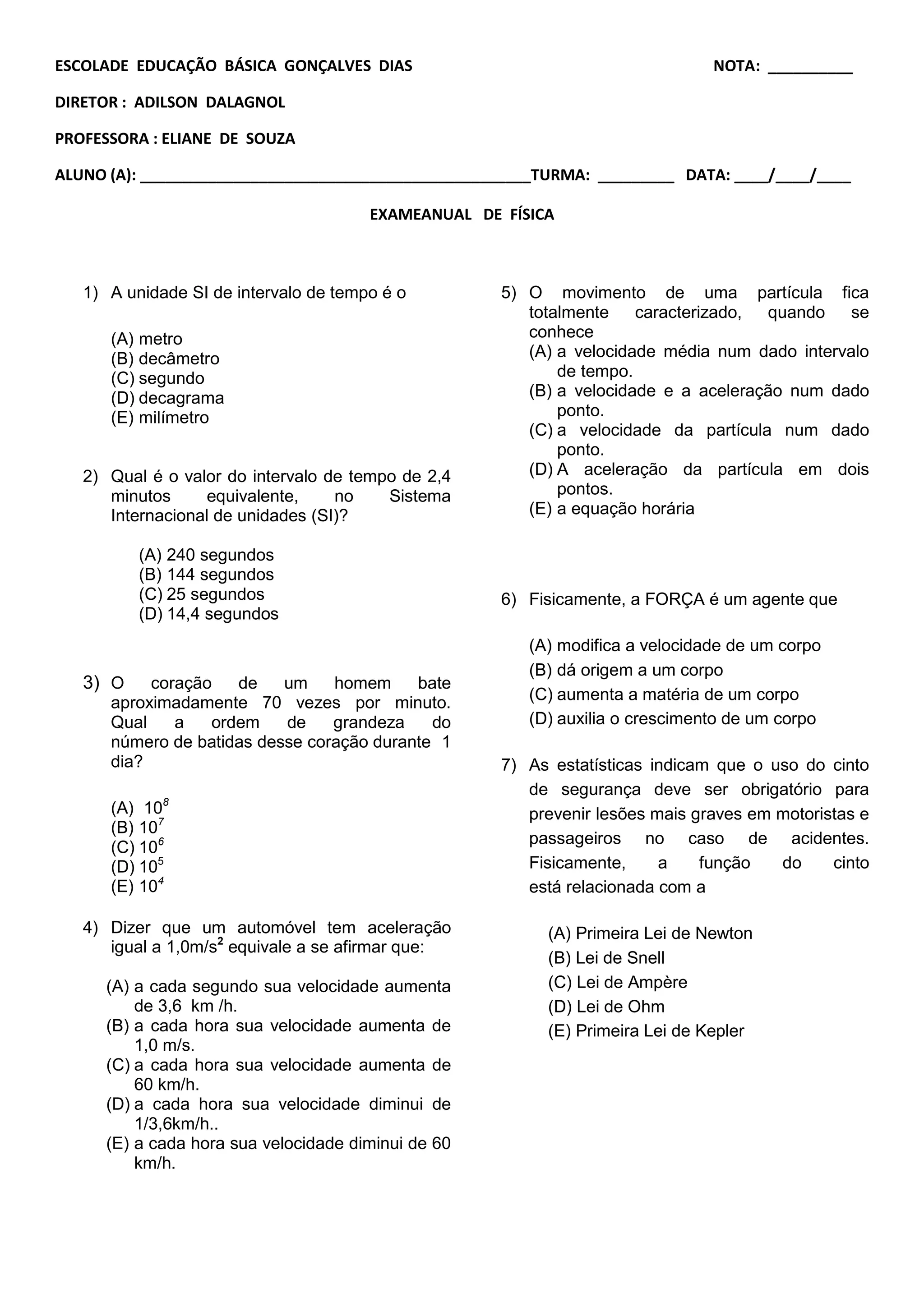 O documento é um teste de física com 10 questões para alunos de uma escola. As questões cobrem tópicos como unidades de tempo no Sistema Internacional, cálculo de intervalos de tempo, batimentos cardíacos, aceleração, caracterização do movimento de partículas, força, leis de Newton e Kepler, velocidade constante e equação de movimento retilíneo uniforme.