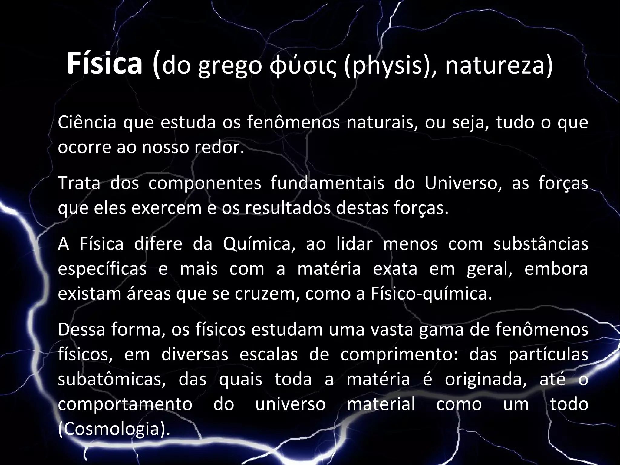A Física estuda os fenômenos naturais e os componentes fundamentais do Universo. Ela analisa uma vasta gama de fenômenos em diversas escalas, desde partículas subatômicas até o comportamento do universo como um todo. A Física pode ser dividida em áreas como mecânica, termodinâmica e eletromagnetismo.
