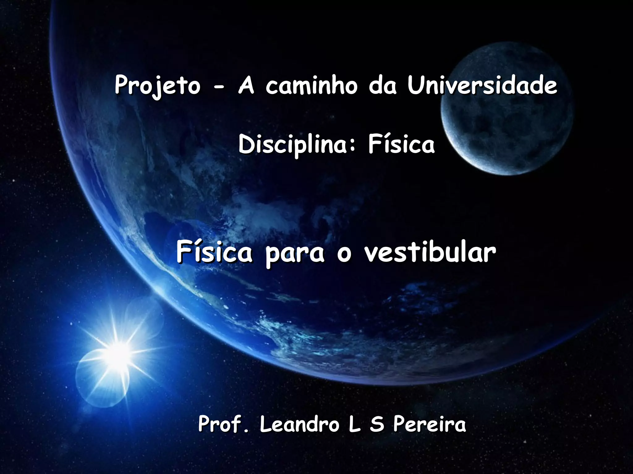 Este documento apresenta um plano de aula para o curso de Física para o vestibular. Ele inclui uma introdução à física, seus objetivos e métodos, seguido por um programa detalhado abrangendo tópicos como mecânica, termodinâmica, óptica e eletromagnetismo.