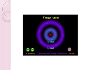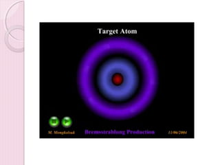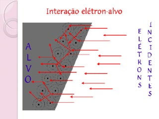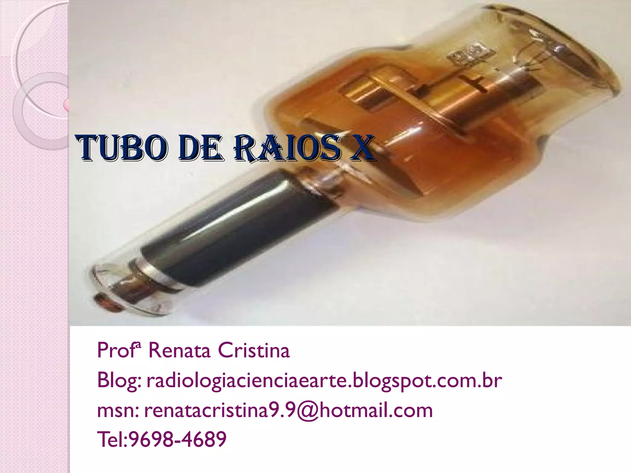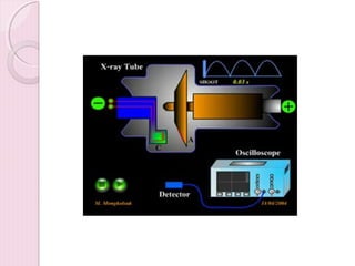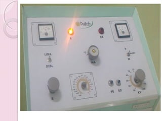O documento descreve os componentes e processo de geração de raios-X em um tubo de raios-X, incluindo: (1) os eletrons acelerados que atingem o alvo geram raios-X através da frenagem e raios característicos, (2) a ampola de vidro contém o cátodo, ânodo e vácuo, e (3) os principais componentes como transformador, cabeçote e mesa de controle.