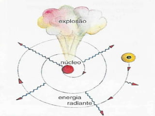 O documento descreve a evolução dos modelos atômicos ao longo do tempo, começando com o modelo de Dalton que propôs que os átomos eram indivisíveis e constituíam os elementos químicos. Posteriormente, o modelo de Thomson propôs que os átomos eram esferas com carga positiva contendo eletrões. Já o modelo de Rutherford, baseado em seus experimentos, indicou que os átomos possuem um núcleo denso no centro. Finalmente, os modelos de Bohr e da nuvem eletrônica desc
