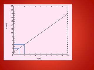 O documento descreve os conceitos de movimento retilíneo uniforme (MRU) e movimento retilíneo uniformemente variado (MRUV). No MRU, a velocidade é constante e a função horária do espaço é S=S0+Vt. No MRUV, a velocidade varia uniformemente com o tempo e as funções horárias são V=V0+at e S=S0+V0t+1/2at2. Gráficos são usados para ilustrar essas relações e calcular velocidades e acelerações. Exemplos e