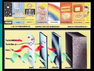 O documento aborda a radioatividade, sua definição, tipos e a história de importantes descobertas na física nuclear, incluindo os trabalhos de cientistas como Becquerel, Curie e Rutherford. Explora a estrutura do átomo, explicando a composição do núcleo e a natureza dos elétrons, bem como as diferentes formas de radiação emitidas durante o decaimento radioativo. Além disso, esclarece conceitos fundamentais como a busca de estabilidade pelos átomos e a classificação das radiações em partículas alfa, beta e ondas gama.