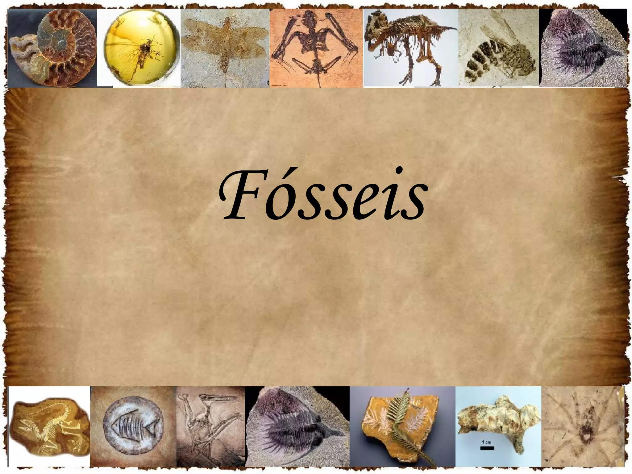 Fósseis são quaisquer vestígios ou impressões de organismos vivos pré-históricos encontrados na crosta terrestre que datam de mais de 11.000 anos atrás. A fossilização ocorre quando há condições favoráveis como soterramento rápido que interrompem a decomposição natural. Os processos de fossilização incluem a carbonificação, substituição, permineralização e incrustação, e a preservação pode ser parcial ou total como na mumificação e em âmbar. Fósseis são classificados como fósseis-