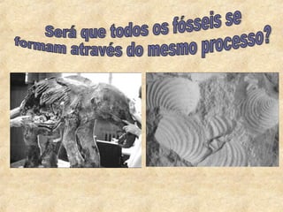 O documento discute como os fósseis fornecem informações sobre a história da Terra, definindo fósseis como restos ou vestígios de seres vivos que viveram há milhares ou milhões de anos. Ele lista exemplos de restos como ossos, dentes e conchas, e vestígios como pegadas e tocas, explicando como cada um pode revelar detalhes sobre o animal.