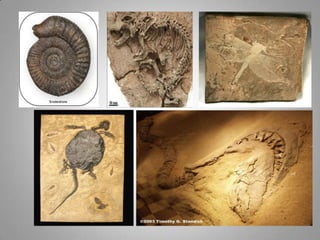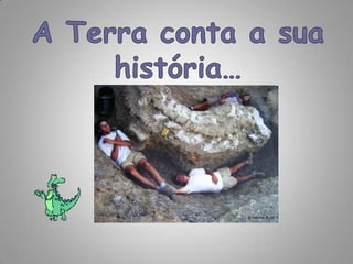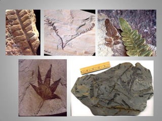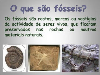 O documento discute os fósseis, definindo-os como restos ou vestígios de seres vivos preservados em rochas. Explora os principais processos de fossilização, incluindo conservação, moldagem e mineralização. Também aborda a importância dos fósseis para estudar a evolução da Terra e datar rochas.