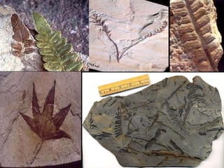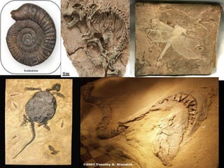 O documento descreve os principais processos de fossilização, incluindo a mumificação, moldagem, mineralização e marcas de atividade. Explica que a fossilização ocorre em vários estágios, incluindo a morte do organismo, soterramento e substituição dos restos por minerais. Também discute exemplos como fósseis de mamutes, trilobites e pegadas de dinossauro.