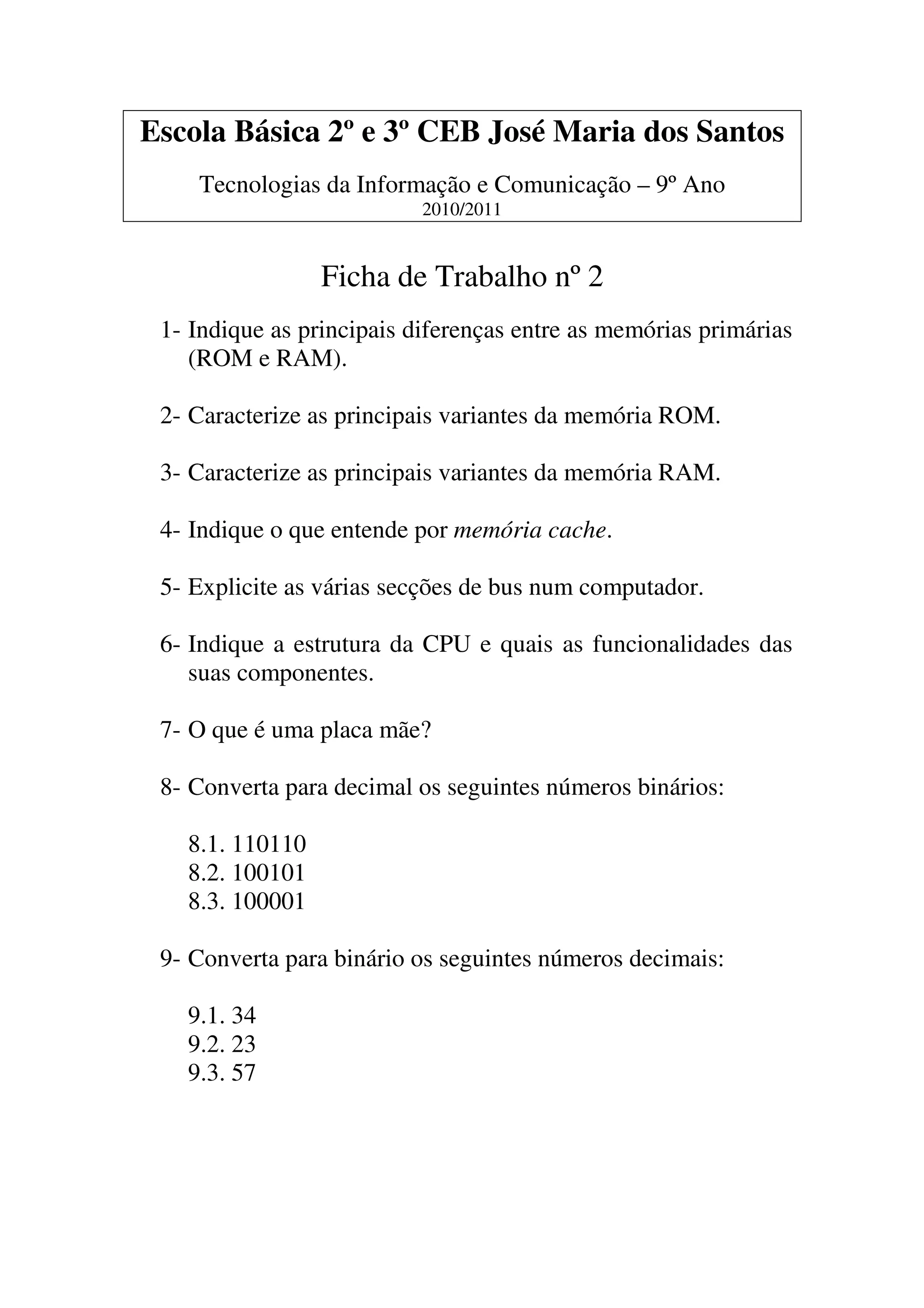 As principais diferenças entre ROM e RAM, as variantes de cada memória, o que é memória cache e estrutura da CPU. Também inclui conversões entre números binários e decimais.