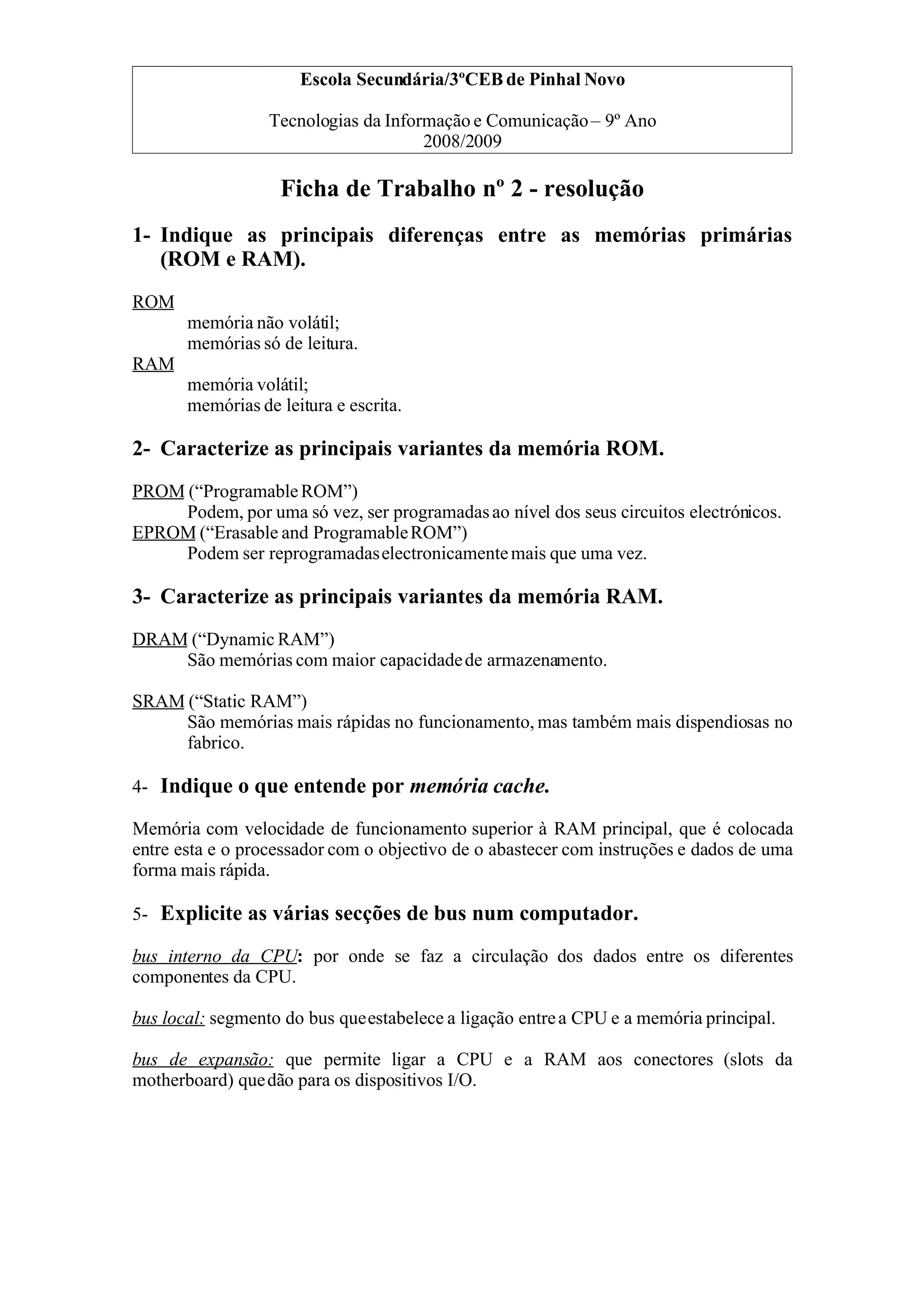 O documento resume as principais diferenças entre as memórias ROM e RAM, caracteriza as variantes da memória ROM (PROM, EPROM) e RAM (DRAM, SRAM), explica o que é memória cache e descreve as seções de barramento num computador e a estrutura da CPU. Também converte números binários para decimais e vice-versa.