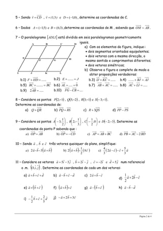 2. Os exercícios incluem determinar coordenadas de vetores, verificar propriedades algébricas e geométricas e calcular expressões envolvendo vetores.