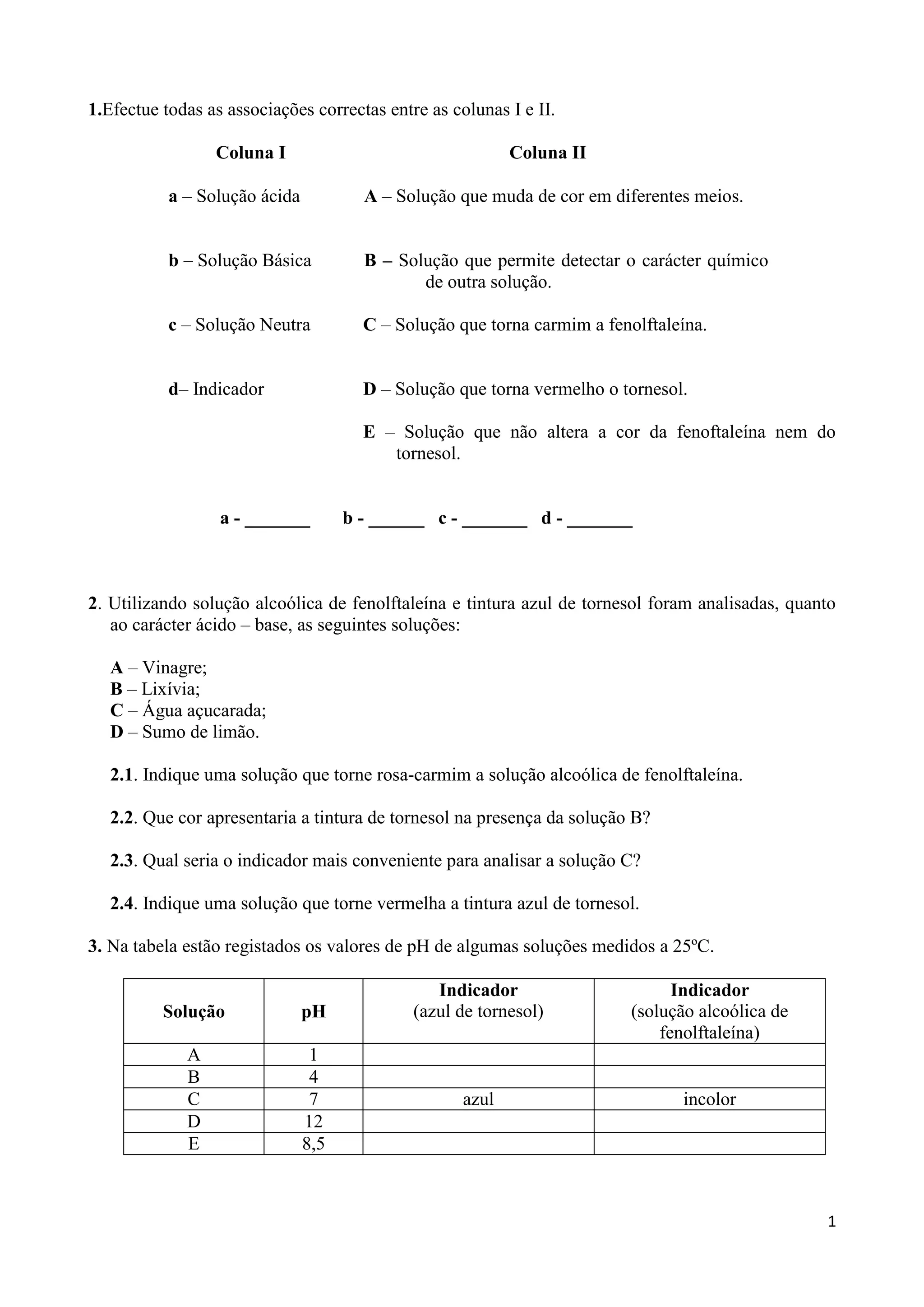2. Utilizando solução alcoólica de fenolftaleína e tintura azul de tornesol foram analisadas, quanto