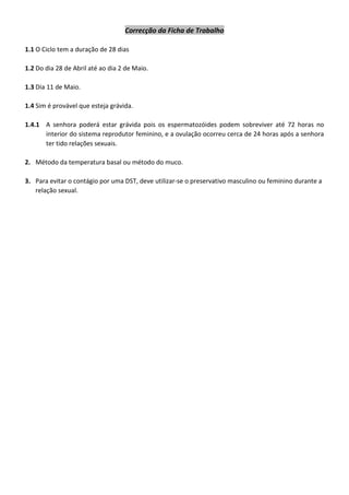 O documento é uma ficha de trabalho sobre o ciclo sexual feminino. Contém perguntas sobre os detalhes do ciclo, incluindo a duração total, datas das fases e da ovulação, e a possibilidade de gravidez dependendo da data das relações sexuais. Também pergunta sobre métodos naturais para detectar a ovulação e como prevenir DSTs.