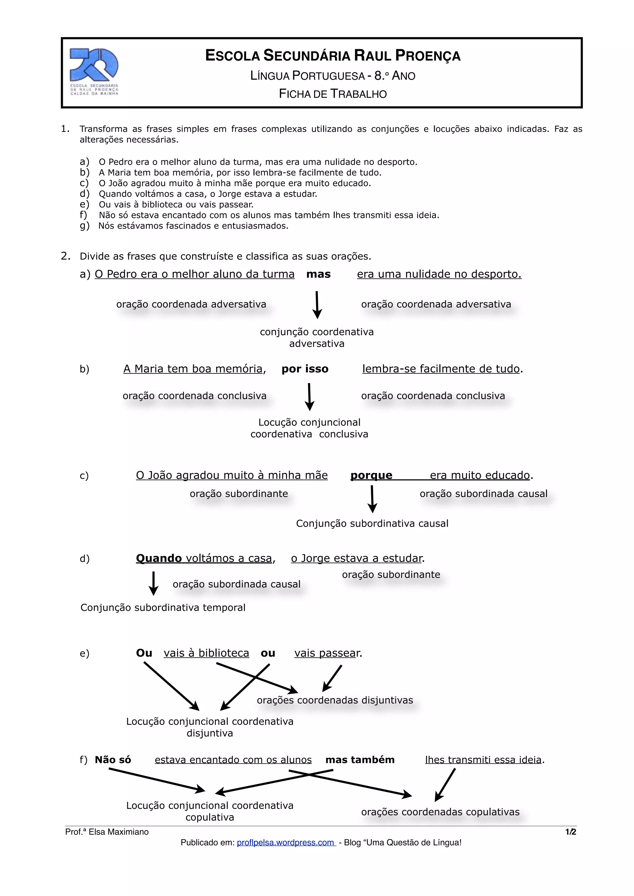 Este documento fornece uma ficha de trabalho sobre língua portuguesa para o 8o ano com exercícios sobre conjunções, classificação de orações e funções sintáticas. Os alunos devem transformar frases simples em frases complexas usando conjunções, classificar as orações resultantes e completar espaços com conjunções.