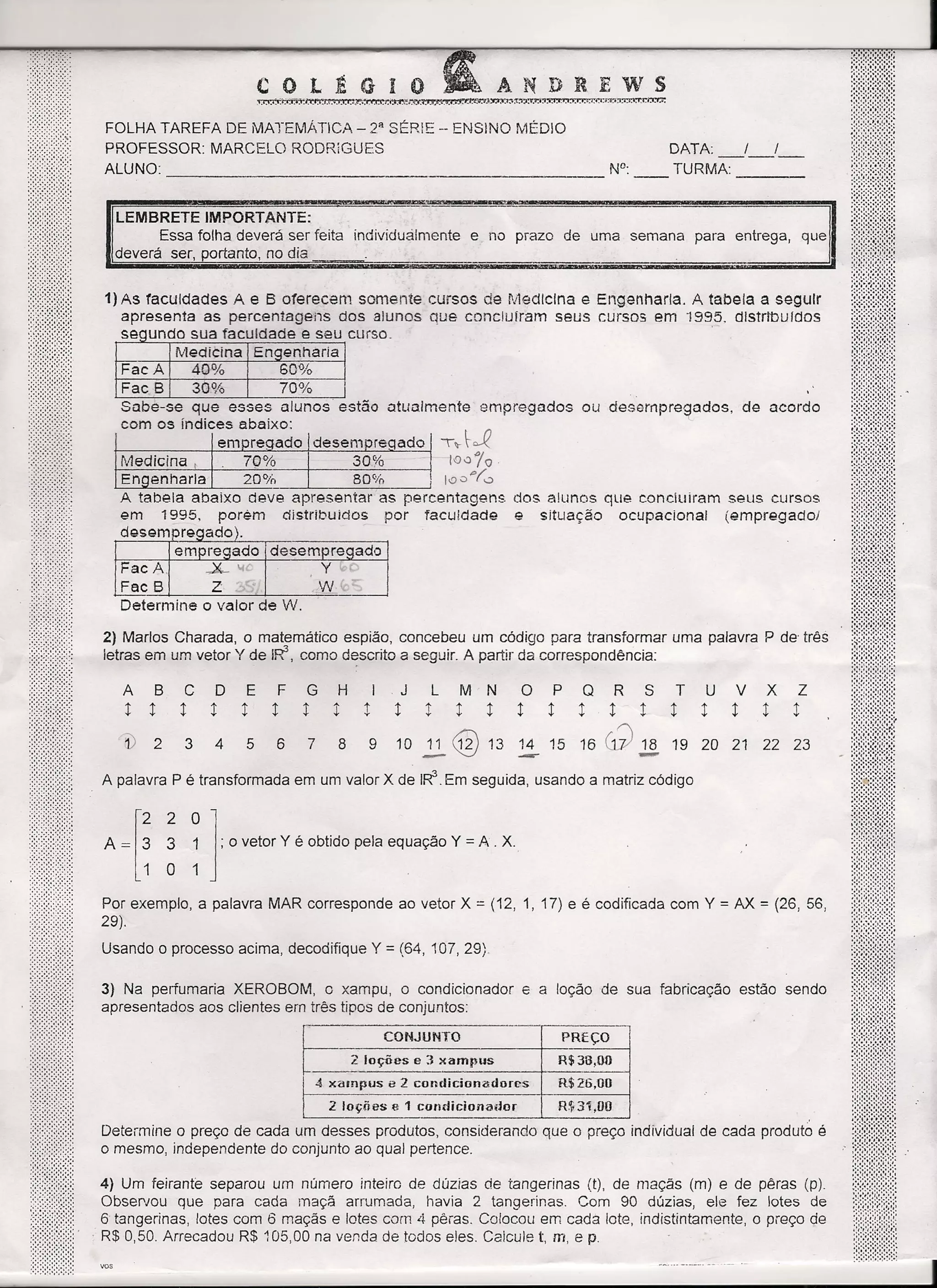 2) Uma palavra é codificada em um vetor usando uma matriz de códigos. A tarefa pede para decodificar um vetor dado.