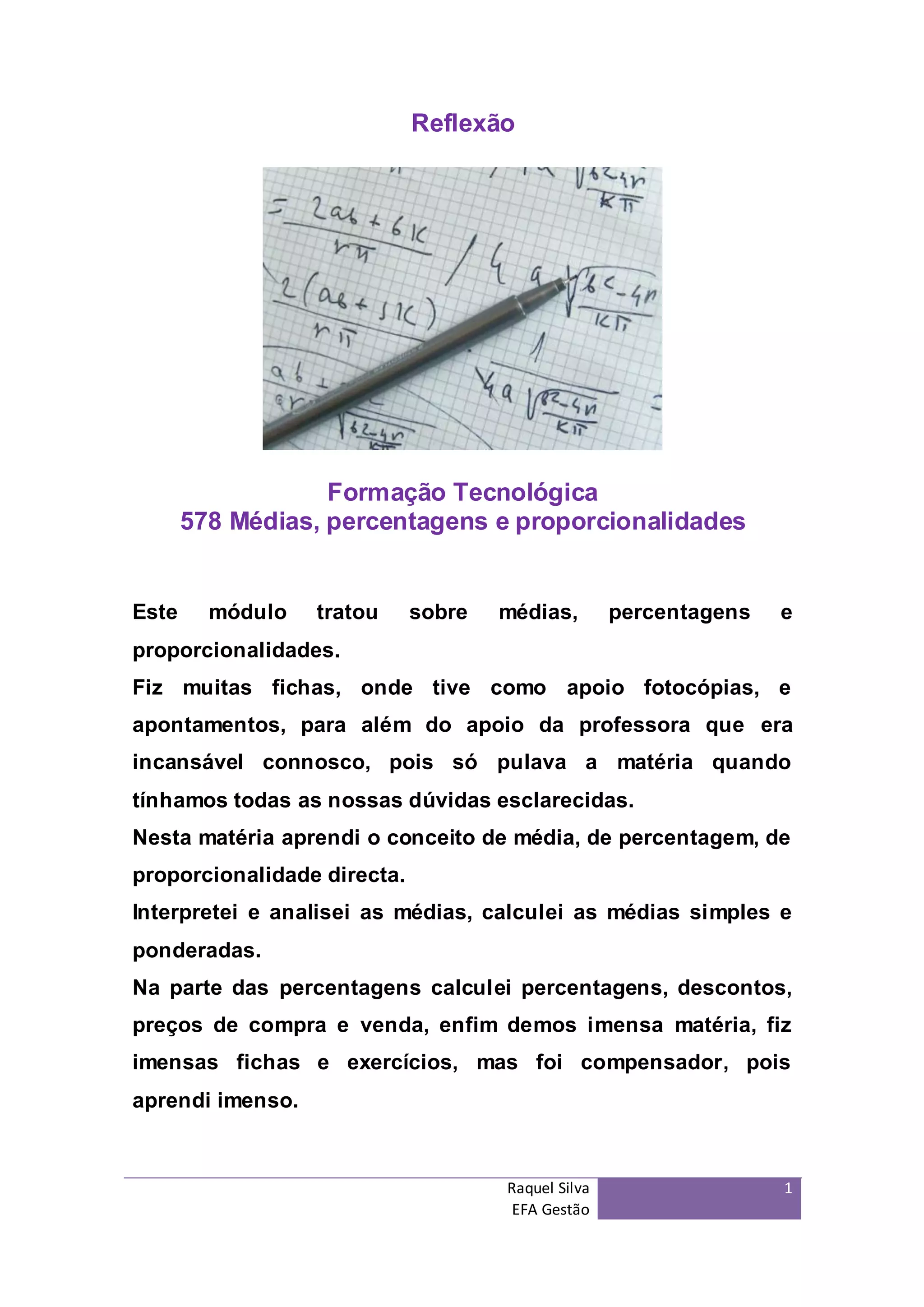 Este documento discute um módulo sobre médias, percentagens e proporcionalidades. A autora aprendeu conceitos como média, percentagens e proporcionalidade direta. Embora inicialmente complicado, a prática a ajudou a entender os conceitos, e ela espera usar esses conhecimentos no futuro.